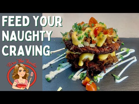 A crispy potato pancake topped with BBQ pulled pork, white onion, and a chipotle cheddar beer cheese sauce, then topped with ANOTHER potato pancake, more pulled pork, onions, and cheese sauce. Garnished with sour cream, jalapeño peppers, tomatoes, and fresh parsley.